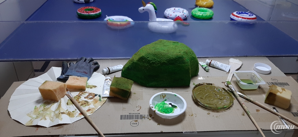 1800* 1800*200mm 거대한 수족관 형식의 베이스와 나무 선베드, 석조탑, 원형탁자, 족욕통, 파라솔 등 소품제작 되었습니다.